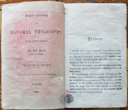 SWIFT, Mary A. 理学初歩 (cover title). First Lessons on Natural Philosophy, for children. [Rigaku Shoho]. Yedo (Tokyo) 1867. 16x11cm publisher's pattern wrapper with printed title label. Illustrations throughout, one with handcolouring. Stitching broken; a used but most acceptable copy. Ownership has been claimed in pencil in English at the back - which would be the front for a Japanese book. Au$165