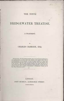 BABBAGE, Charles. The Ninth Bridgewater Treatise. A fragment. London, Murray 1837. Octavo publisher's cloth with paper spine label (the bottom of the spine and the front edge of the top board neatly repaired, some insect nibbling around the edges of the cloth and of the label); ppxxii,xxiii-240,241-244*, (H3 numbered 101 on recto as is H4), and single page publisher's list. Front endpaper foxed, diminishing to a few spots on the title, inside a very good fresh copy). The label with the price 9s6d. Au$1,250