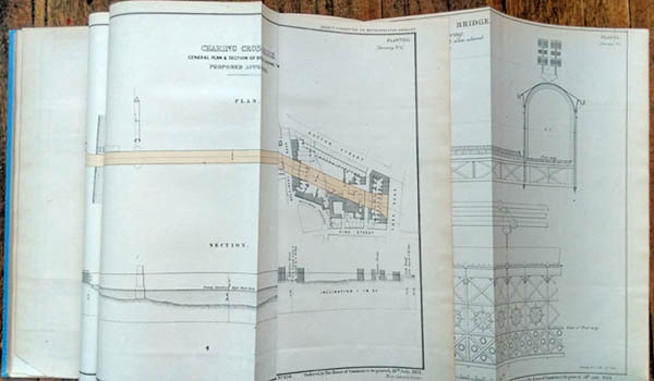 Bridges. Report From the Select Committee on Metropolitan Bridges; together with proceedings of the committee. London, ordered to be printed 1854. Foolscap modern cloth backed boards, printed label; xii,xii,195pp and 11 plans, views and elevations (10 folding). Au$800