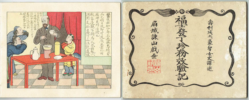 A chaming bit of fakery. The makers of Phosphatine - the patent baby food - enlisted the distinguished scholar and translator of things Chinese and Japanese, Judith Gautier, to create a traditional Chinese folktale in which the survivor of a shipwreck manages to get off with some of the cargo and is rescued and nursed by a local Mandarin and his family. Pausing only to change into a suit which must have been in his uniform pocket he repays the family by introducing them to Phosphatine. This golden source of health soon works its magic among the neighbours, word spreads and by the end a whole generation of healthy Chinese babies is made possible.