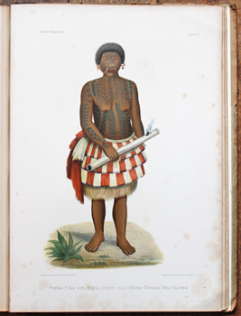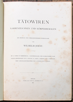 JOEST, Wilhelm. Tatowiren. Narbenzeichnen und Korperbemalen. Ein beittrag zur vergleichenden ethnologie. Berlin, Asher 1887. Folio publisher's cloth backed printed boards (recased and rebacked preserving the original spine, edges somewhat rubbed and scraped); [2],viii,128pp, one plain and 11 coloured lithograph plates, illustrations through the text. Some browning and spotting but a very presentable copy. Au$4,000