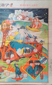 Sugoroku. Kawabata Ryushi. 少年未来旅行双六 [Shonen Mirai Ryoko Sugoroku]. Tokyo, Nihon Soonen 1918 (Taisho 7). Colour broadside 78x54cm. Some repaired tears and small holes. Not bad for a sugoroku printed on less than robust paper.