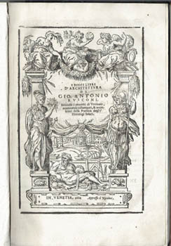 RUSCONI, Gio. Antonio. I Dieci Libri d'Architettura. Venice, Nicoloni 1660. Small folio (18th century?) roan backed speckled boards (neatly recased); [6],148pp, allegorical title page and a plethora of bold wood engravings throughout. A crisp, fresh copy. Au$2,500
