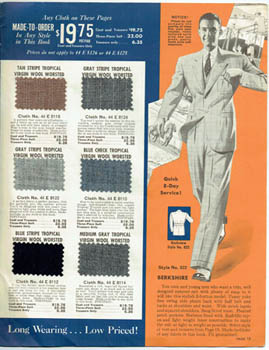 Catalogue - Men's suits. Sears Roebuck & Co. Made to Order Clothes for Men and Young Men. Spring and Summer 1937. The company 1937. Quarto publisher's illustrated wrappers (corner gone from the top corner of the front); 16pp, illustrated throughout and with some 60 mounted fabric swatches. A pretty good copy complete with the order forms and the four page brochure on how to measure yourself. Au$90