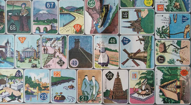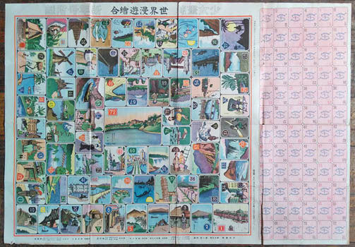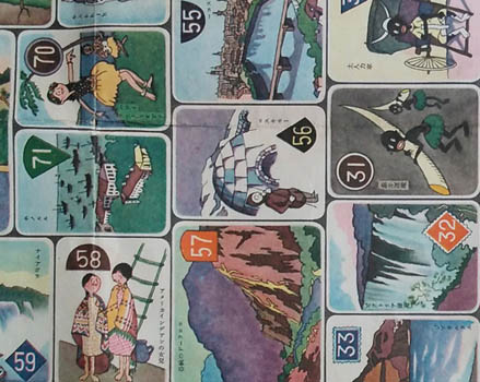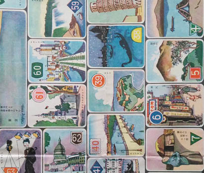 Maybe not a sugoruku proper - is there a rule? - this game is played with cards, all 72 still on the sheet. This round the world game was the 1930 New Year gift from the magazine Shojo Gaho - Girls Illustrated.