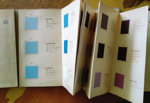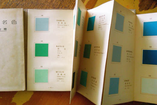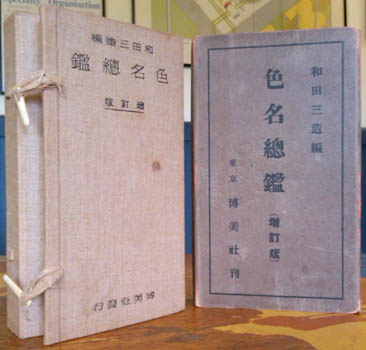 Wada Sanzo. 色名総鑑 (増訂版) [Shikimei Sokan (Zoteiban)]. Tokyo, Hakubish 1935 (Showa 10). 19x11mm publisher's cloth case with 171 mounted colour samples on 57 accordian folding leaves and card bound book; 182,8pp and a folding tables. Colour samples named in Japanese, English and occasionally French or German; table of multi language lists of colour names. A little browning, minor signs of use, and still a very good copy in a mildly worn original printed card folding case. Au$475