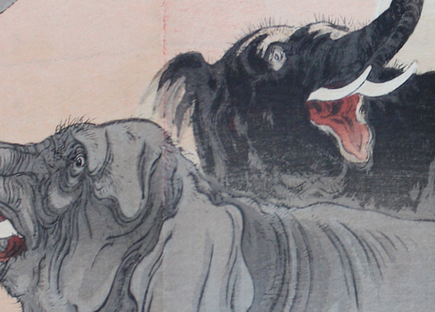 Adolphe Belot & Kuroiwa Ruiko. 人外境 [Ningaikyo]. Tokyo, Fusudo 1897 (Meiji 30). Three volumes 22x15cm publisher's colour woodcut wrappers, thread tied (some short tears and chips). Three folding colour woodcut frontispieces by Tomioka Eisen. A couple of owner's stamps in each, title written in ink on the bottom edges). Browning, smudges and signs of use. Certainly well read but still rather good copies for popular thrillers like this. And most important: those frontispieces are intact* and clean. They are the magic you don't get in the original or English translations. The third frontispiece shows those women warriors at work in their spiked armour. They liked to get in close and had no mercy. Au$500