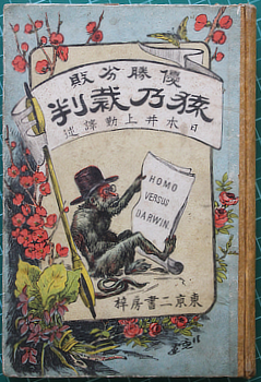 Darwin. William Penman Lyon & Inoue Tsutomu. 猿乃裁判 : 優勝劣敗 [Saru no Saiban : Yusho Reppai] 'Homo versus Darwin' incorporated into the cover illustration. Tokyo, Nishimura Tomijiro 1888. 19x13cm publisher's colour illustrated boards (by Kiyochika), cloth spine (covers marked and scraped around the edges, spine with a smallish hole in the back hinge); three full pages illustrations. Some insignificant browning; rather good for one of these boru hyoshi books. Small woodcut bookplate of writer Nagao Momoro. Au$3500