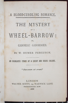 Hume. FERGUSON, W. Humer. The Mystery of a Wheel-Barrow: or Gaboriau Gaborooed. An idealistic story of a great and rising colony. [headed: A Blood-Curdling Romance]. London, Walter Scott 1888. Octavo, without wrapper in neat modern cloth; one full page illustration, "The Cryptogram", in the text. Preliminary blanks spotted, virtually gone by the title page and clean and bright from there on. There is a professional looking proof reader's pencil correction in one margin. Unremarkable maybe but, why would anyone read this so carefully? Au$950