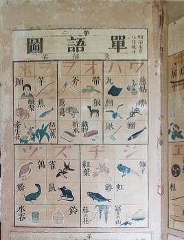 These are the elementary school wall word charts (Tangozu) and collocation or phrase charts (Rengozu) issued by the Ministry of Education. There were eight of each produced but six is what made it on to this extraordinary piece of furniture. I can only guess it was made to divide a classroom. Charts seven and eight of the Tangozu series were plants and animals.