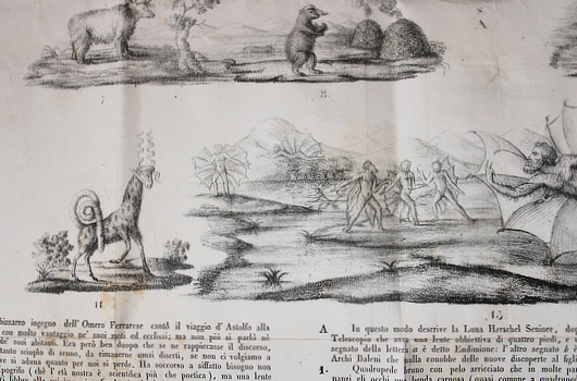 Locke's account in the New York Sun in August 1835 of Herschel's discovery with his revolutionary new telescope of life on the moon was the first definite report by a credible scientist and the news spread faster than a trip to the moon would take. The French might have been first with a translation - might have - but it seems to me that no-one took to this discovery with greater relish than Italy. Accounts of varying forms blossomed in cities all over Italy. This one is quite handsome, specially when compared with the plain Jane New York original.