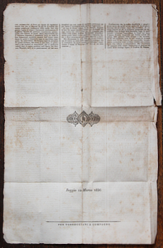 Herschel. [LOCKE, Richard Adams]. Maravigliose Osservazioni su la Luna Recentement Fatte da Giovanni Herschel. Traduzuione dal Francese. Reggio, Torreggiani e Compagno March 1836. 45x29; four pages, disbound with remant of binding tab. Folded; some browning, a tear in the centre fold and small holes and splits elsewhere. Au$750