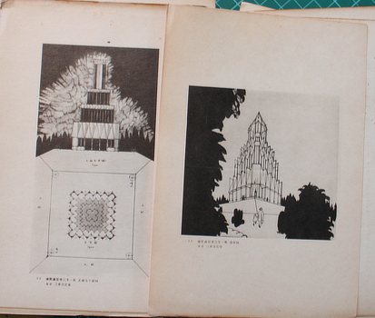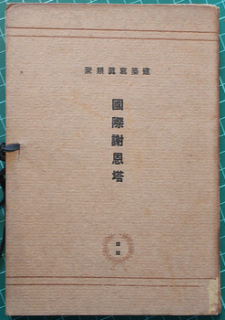 Architecture competition. 国際謝恩塔 [Kokusai Shaonto]. Tokyo, Koyosha 1924 (Taisho 13). 19x13cm, loose as issued in publisher's printed boards; 50 leaves, mostly plates printed on one side (actually 48 as two are double page carrying two numbers); renderings, elevations and plans. Wear to spine, dust marks or darkening to the very top edge of several plates, a decent secondhand copy. Au$150