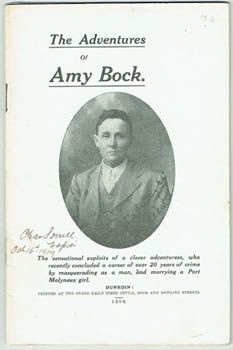 Amy Bock. [ROBSON, R.W.] The Adventures of Amy Bock. The sensational exploits of a clever adventuress, who recently concluded a career of over 20 years of crime by masquerading as a man, and marrying a Port Molyneux girl. Dunedin, printed at the Otago Daily Times Office, 1909. Octavo publisher's illustrated wrapper; 40pp including wrapper, plus ten full page plates. Rather good. With a contemporary post card of Amy/Percy sent by Edie to Fluffy, giving news of the upcoming Thornbury Ball. Au$650