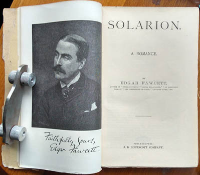 FAWCETT, Edgar. Solarion. A romance. in Lippincott's Monthly Magazine, September 1889. Largish octavo publisher's printed wrappers (some neat repairs); frontispiece portrait, title page and pp297-369 along with the rest of the issue and advertisements at each end. The wrappers a bit chipped, the contents fresh and bright. Au$600
