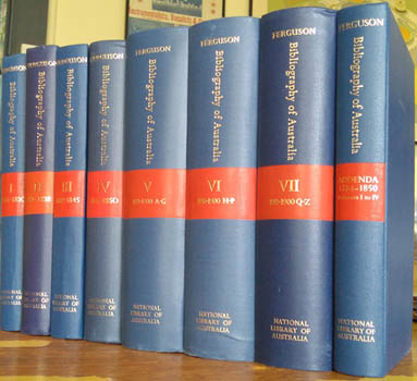 FERGUSON, John Alexander. Bibliography of Australia. Canberra, National Library 1976-86. Eight volumes octavo cloth. A good set including the addenda volume. Au$100