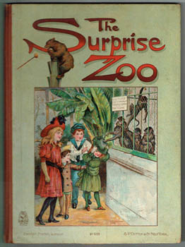 >Moveable book. BINGHAM, Clifton. The Surprise Zoo. Verses by Clifton Bingham. London, Ernest Nister [1910?]. Small quarto publisher's cloth backed illustrated glazed boards; [4]pp and six chromolitho moveable plates, each with facing text. Inner hinges cracked, signs of use but quite good, all plates work and missing only part of a flamingo head from a small flock. A christmas gift inscription dated 1911. Au$350 The animals change in each cage as the tabs are pulled: Lion for cubs, monkeys for kangaroo, toucan for flamingos and so on. The surprise for me was how many copies I could find in the world's libraries: one.
