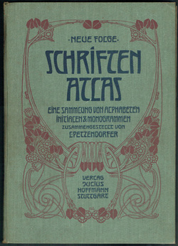 >PETZENDORFER, Ludwig. Schriftenatlas. Neue Folge. Eine sammlung von alphabeten, initialen und monogrammen. Stuttgart, Julius Hoffmann [1905?]. Folio publisher's printed decorated cloth; [8]pp and 141 plates printed in varying or two or more colours. Quite good in worn original card case. Au$1500 Apparently published in parts between 1903 and 1905 this should not to be confused with Petzendorfer's first Schriften-Atlas published a decade or so earlier. This is a new and thoroughly up to date survey of alphabets and typefaces, monograms and signs; is a treasury of nouveau, jugendstil and secession styles; and is much scarcer than his first atlas. Designers are all named: Behrens, Grasset, Morris, Gradl, Lewis F. Day, Ellwood, Auriol, etc; in the case of types the foundries are named.