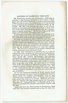![]() [ATKINSON, Henry Dresser]. Jottings of Tasmanian Bird-Life. n.p. [Tasmania, offprint? c1890]. Octavo, stapled; drop title; 16pp (last blank). Au$50 The National Library's dating - one of the three copies found by Trove - should be ignored. Whoever created that entry should be either flogged or given a quick course in logic. Atkinson - clergyman, son of a clergyman and father of clergymen - gets an entry in Whittell but no bibliography; his brother gets a brief bibliography.