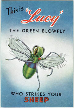 Blowflies. This is "Lucy" the Green Blowfly Who Strikes Your Sheep. The Australian Wool Board [1948]. Octavo colour illustrated wrapper; [28]pp, illustrated throughout, a couple in colour. An old fold, a nice copy. Au$85 This would seem to be completely unknown but for two country papers that in late 1948 ran short notices about the booklet - 40,000 copies - being sent to sheep farmers everywhere. Lucy is cute in an Algy the ant way, cuter than the sheep.