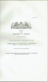 ![]() Chinese in Australia. Chinese Question: Correspondence, and Report of Conference Held at Sydney, June, 1888. [Hobart] Govt Printer, 1888. Foolscap, modern plain wrapper; 39pp. Au$400 The Chinese Question (ie how do we get rid of them?) brought the colonies together as few other problems ever could. Gathered here is a useful compilation of official and unofficial correspondence from all the colonies, including letters and petitions from Chinese residents in Australia and news from America about their new treaty with China. The colonies had to find their way round directions from London where measures such as the poll tax were seen as a threat to Chinese-British relations. The result was The Chinese Immigration Restriction Act of 1888.