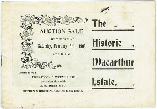 ![]() Real Estate. The Historic Macarthur Estate. Auction sale on the ground Saturday, February 3rd, 1906 ... Richardson & Wrench, Ltd ... n.p. [Sydney 1906]. 12x18cm, printed self wrapper; 12pp including covers, photo illustrations - one double page - and a small sketch map. Au$80 The photos are mostly of grand homes in the neighbourhood - reassurances - and the centrefold is a view of a paddock: the estate about to be split into digestible portions.