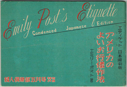 ![]() POST, Emily. Emily Post's Etiquette. Condenced Japanese Edition. アメリカのよいお行儀作法 [Amerika no Yoi o Gyogi Saho]. [Tokyo?] Fujin Kurabu [Women's Club] 1950. Oblong octavo publisher's wrapper; 64pp, line drawings throughout, a few full page. Au$50 Here we are in occupied Japan when middle class American values and aspirations are force fed into the country. Who better to teach the Japanese how to behave like ambitious suburbanites wanting to make the country club than Emily Post? This was issued as a supplement by the Women's Club magazine. No copies located in any of the expected catalogues.