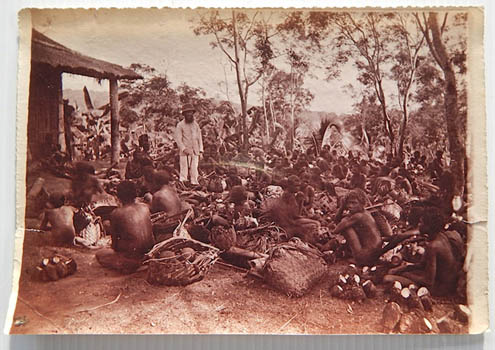Market day at Queen Emma's >Photograph. Richard Parkinson - New Britain. Photograph titled on the back in pencil: Market Day in Ralum - Parkinson. n.p. [188-?]. Albumen print 112x163mm; single weight paper. A bit rumpled, with a corner crease and a couple of short tears. Au$300 A portrait of Richard Parkinson presiding over a gathering. Brother-in-law of Emma Coe - Queen Emma of New Guinea - and pioneer colonial of the area, Parkinson established Emma's plantation at Ralum, near Rabaul, in 1882. Parkinson married Emma's sister Phebe in Samoa in 1879 and they joined Emma and Thomas Farrell in the Bismarck Archipelago in 1882.