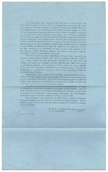 ![]() Poor room-keepers. Printed letter signed by Henry G. Douglass and E.M. Stephens importuning subscribers to found in Sydney a Poor Room-Keepers Society for the relief of sick and indigent room-keepers. November 12 1861. n.p. [Sydney 1861]. Foolscap broadside on blue paper. Folded. Au$25 While sturdy beggars and victims of vice and drunkenness are well provided for, the shy room-keeper down on his luck remains unnoticed.