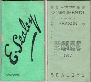 How to complain in Condobolin >Groceries. E. Sealey, Condobolin. With Compliments of the Season 1917. Sealeys. Printed by Lachlander Print, Condobolin 1917. 12mo flush cut reinforced printed wrapper (a bit used); 12 leaves (24pp) of printed announcements etc on green paper, each interleaved with four leaves of faint ruled notepaper; a total of 88pp by my arithmetic. The first page has some baffling notes, most in German. Sinister or what? Au$100 J.R. Sealey, Grocer of Condobolin - in the middle of NSW - must have had a prickly relationship with the town. The first page of text - on the back of the season's greeting - sets out rules for complaints, of which they'd had several during 1917. The other printed pages parade the wealth of things they stock and an illustrated reassurance that they care about their customers.