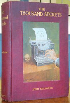 The first emoji novel? >SELBORNE, John. The Thousand Secrets. London, Everett 1911. Octavo publisher's cloth with mounted colour illustration. A bit used, a bit browned; a pretty decent copy. Au$475 First edition of this thriller which surely must be the first emoji mystery. At the scenes of the crimes the villain leaves a cryptic typed smiling face. Did he or she kill only owners of typewriters or carry spares?