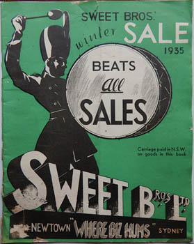 >Catalogue - fashion, haberdashey &c. Sweet Bros. Newton. Sweet Bros Winter Sale 1935 - Beats all Sales. Sydney, 1935. Quarto publisher's illustrated wrapper; 32pp, illustrated throughout. A neglected copy, rumpled, some tears, insect damage, the back wrapper quite chewed by insects. Au$120 I was about to admit this isn't the best copy of this catalogue but it may well be. I can't find any competition. The NL has a 1909 catalogue from the one time Syney landmark. Anything and everything else seems gone.