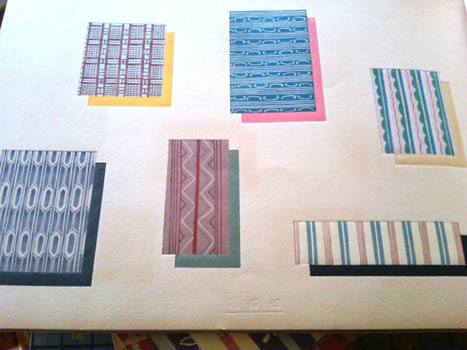 >Tokuriki Tomikichiro. 縞と絣 [Shima to Kasuri]. Kyoto, Uchida 1931-32. 10 volumes 25x35cm publisher's decorated wrappers (library labels on the fronts), original chitsu - folding case; 100 colour woodblock plates printed on one side of double folded leaves. Au$2100 A lively and charming set of pattern books of textile designs. Shima is stripes and kasuri is resist dying or ikat. In reproduction this appears cheerful and modest and it is cheerful, but the quality of block cutting and printing is astonishing.
