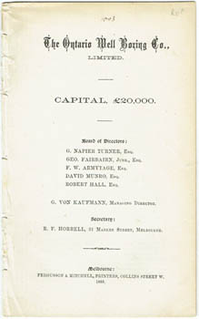 ![]() Water. The Ontario Well Boring Co. Limited. Melbourne, printed by Gergusson & Mitchell 1888. Octavo disbound; 11pp. Au$35 A prospectus or puff for the new company: a brief report followed by newspaper reports of their artesian well drilling exploits. Unrecorded.