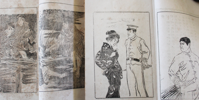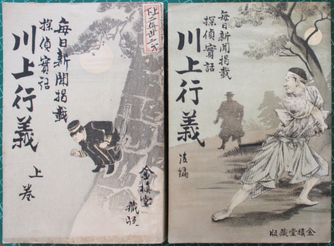 Aoba (ie Ihara Toshiro?). 川上行義 : 探偵実話 [Kawakami Yukiyoshi : Tantei Jitsuwa]. Tokyo, Kinshindo 1900 (Meiji 33). Two volumes 22x15cm publisher's colour woodcut wrappers; full page b/w illustrations in each volume, a couple double page. Browning of the cheap paper in the second volume, not so much in the first. A couple of owner's stamps; title written in ink on the bottom edges of each. Signs of use but pretty good. Au$250