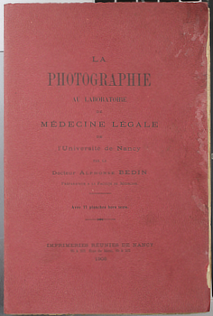 BEDIN, Alphonse. La Photographie au Laboratoire de Medecine Legale de l'Universite de Nancy. Nancy, Imprimeries Reunies 1908. 25x17cm publisher's printed wrapper (front edge of the front wrapper a bit stained with a small chip); 132pp, errata leaf and 77 photo plates. Rather good. Inscribed and signed by Bedin to l'Abbe Pompey. sold