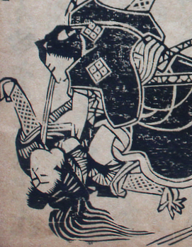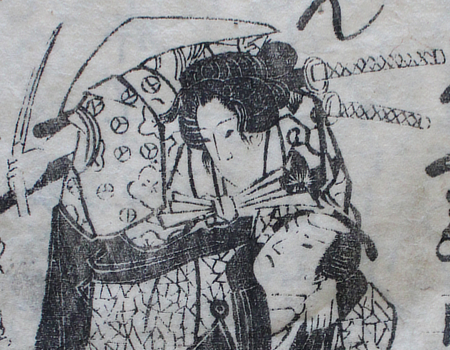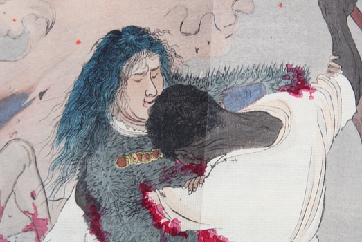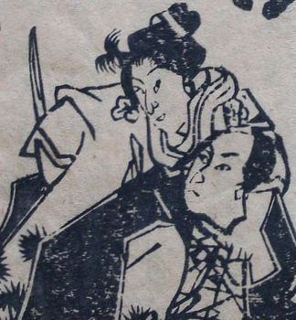 The story of our dokufu (poisonous woman) is a tangle of contradictions depending on whether it came from song - like this one - kabuki, or rakugo (story telling). However she became a thief, the important bit is that she avenged her father's murder and in turn was killed by her victim's son. The two illustrations make that plain enough. I did come across mention of a version in which her daughter avenged her killing without realising her mother had killed his father. That one has the makings of a long running soap opera.