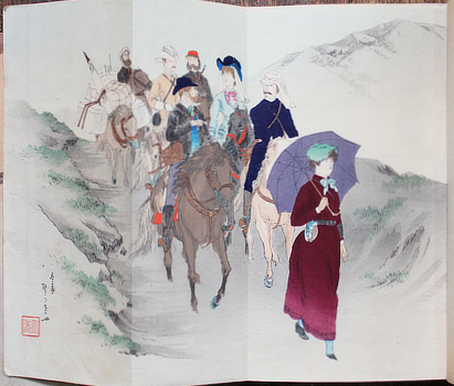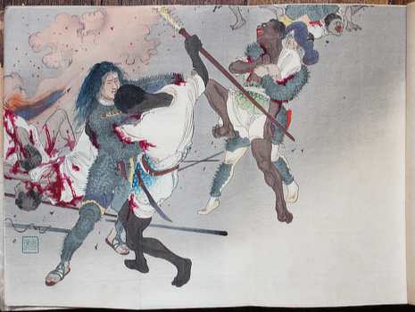 Adolphe Belot & Kuroiwa Ruiko. 人外境 [Ningaikyo]. Tokyo, Fusudo 1897 (Meiji 30). Three volumes 22x15cm publisher's colour woodcut wrappers, thread tied (some short tears and chips). Three folding colour woodcut frontispieces by Tomioka Eisen. A couple of owner's stamps in each, title written in ink on the bottom edges). Browning, smudges and signs of use. Certainly well read but still rather good copies for popular thrillers like this. And most important: those frontispieces are intact* and clean. They are the magic you don't get in the original or English translations. The third frontispiece shows those women warriors at work in their spiked armour. They liked to get in close and had no mercy. Au$500