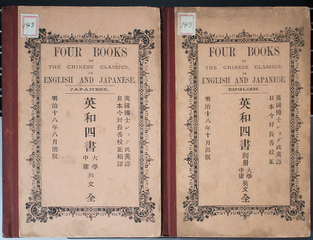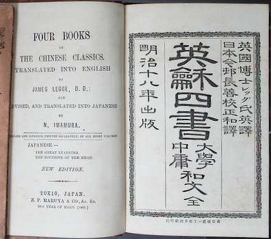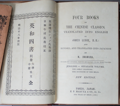 Confucius. James Legge & Imamura Nagayoshi. Four Books of the Chinese Classics. Translated into English by James Legge ... revised, and translated into Japanese by N. Imamura. Tokyo, Z.P. Maruya (ie Maruzen Shosha) 1885. Two volumes 19x13cm publisher's printed boards, cloth spines. Rather good. Note that they open right to left. Au$300