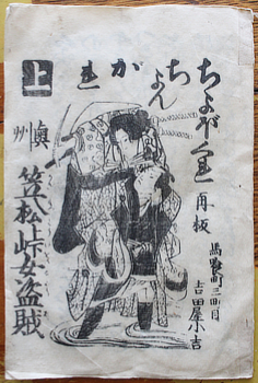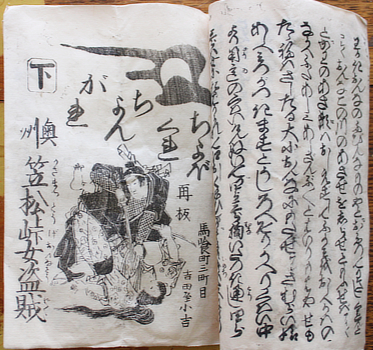 This particular version of the story of Omatsu, the woman thief and killer of Kasamatsu Pass, exists in at least four different versions. The illustrations were redrawn and with the text was recut for each. Since all the copies I've traced were published by Yoshidaya Shokichi it suggests a lot of blocks were worn out printing a lot of copies. This one seems early and is labelled a reprint (再板) on the titles; it matches Waseda's copy.