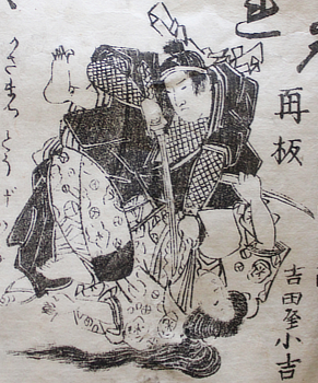 First edition of this rare true detective story; that's what the title says it is (true detective, not the rare bit). This is the story of Kawakami Yukiyoshi, an army sergeant who deserted in 1880 in order to avenge his father. He became a hero and a six part novel called (more lor less), A new Story : Kawakami Yukiyoshi's Revenge by Okamoto Kisen appeared in 1881. That looks like it came came directly from a kabuki production or would soon be one.