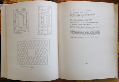 First and best edition. A practical copybook and one of the great efforts of collection if not classification; the first on Chinese lattice the author thinks since 1631. The result of twenty years collecting, Dye called an end to his work with the death of his draughtsman Mr Yang Chi-shang in January 1936. He does comment that though there must be more examples he hasn't found, some three hundred patterns collected since 1933 but not included in this book contain no basic variants.