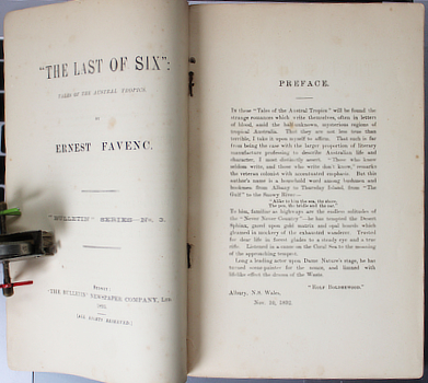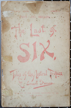 FAVENC, Ernest. The Last of Six: tales of the Austral tropics. Sydney, the Bulletin 1893. Octavo publisher's printed wrapper (the red printing faded away as usual). Quite good in a scrappy cover: the front wrapper is quite chipped, spotted, stained, and was at some time secured by sticky tape; the back has a couple of small chips and those tape marks. The front has been lined with Japanese tissue which doesn't obscure the advertisement on the inside and refastened to the spine. sold