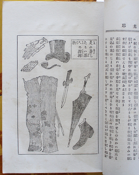 Emile Gaboriau & Kuroiwa Ruiko. 人耶鬼耶 : 裁判小説 [Hitokaonika : saiban shosetsu]. Tokyo, Okawaya 1895 (Meiji 28). 22x14cm publisher's colour illustrated wrapper; four double page, two single page illustrations. Signs of use, a few smudges; pretty good for a popular thriller. sold