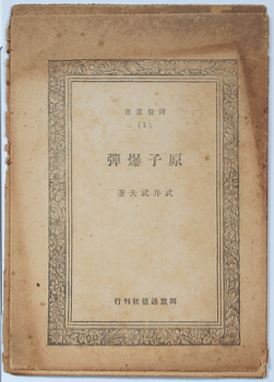 Takeo Takei. 原子爆彈 [Genshi Bakudan (ie: Atomic Bomb)]. Tokyo, Domei Tsushinsha September 1945. 20x14cm; 32pp including wrapper, mostly untrimmed and loose (apparently as issued). Rather browned and a bit frayed round the edges. Au$750