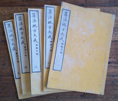 Giichi Akita. [var. Hodo Akita]. 算法地方大成 [Sanpo Jikata Taisei]. Tokyo, Kitajima Junshiro &c 1837 (Tenpo 8). Five volumes (25x18cm) publisher's wrappers; 4,156 double folded leaves, numerous woodcut illustrations. A very good set. Au$350