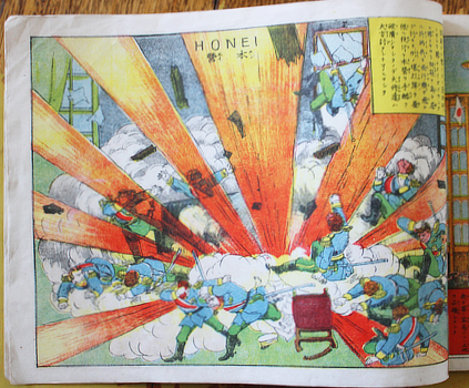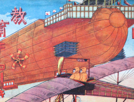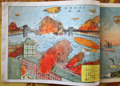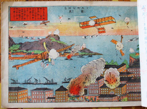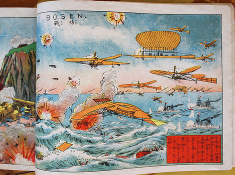 Fourth printing according to the colophon; it first appeared in 1911 when airplanes could barely cross the channel and Japan's first aviators had only just got off the ground. I don't know who Japan is fighting here but they are westerners, often with red hair and beards. Quite like Russians.