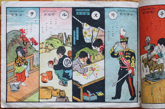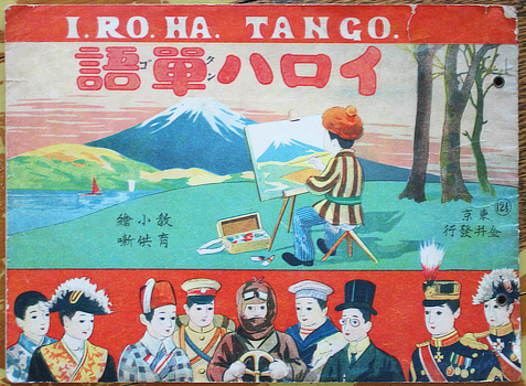 イロハ単語 I. Ro. Ha. Tango [cover titlle]. Tokyo, Kanai Shinseido 1917 (Taisho 6). 19x26cm publisher's colour illustrated wrapper; two punched holes with metal grommets as published; six double folded leaves (ie 12 pages) and wrapper, each page a full page colour illustration. Wrappers a bit torn and chipped; signs of use but acceptable. Au$225