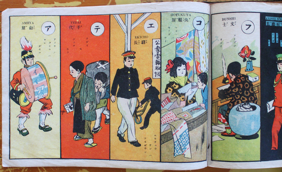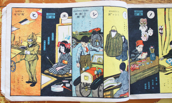 An ABC of occupations. There are a couple of jobs for girls; they seem to involve cleaning. This is no 124 of Kanai Shinseido's long series of educational picture stories. The double folded leaves are a lavish touch for a cheap kids' book like this; it's a big step up from the akahon (red books) coming out of Osaka.