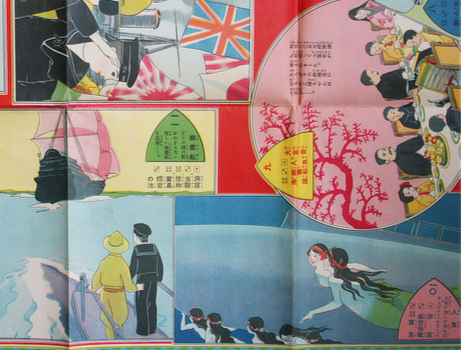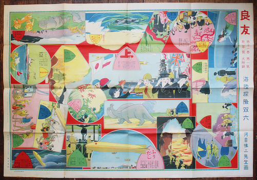 Kawame Teiji. 海底探検双六 [Takei Tanken Sugoroku]. Kodomosha 1926 (Taisho 15). 55x78cm colour illustrated broadside. Some small holes in folds; pretty good. Au$375